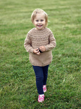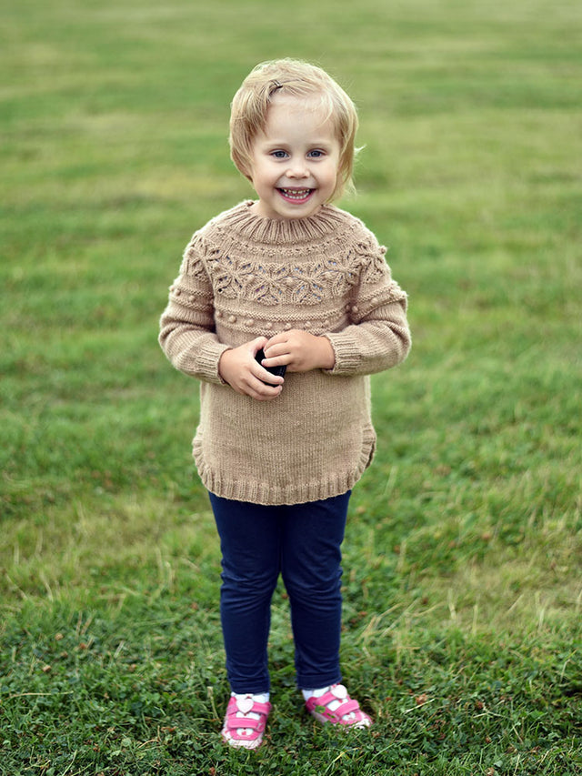 Let your little star shine in this adorable Child's Starflake Sweater! Knit this cozy warm sweater, featuring long sleeves, a crew neck, and a scoop bottom. The yoke design has lacy starflakes, punctuated with fun bobbles that wrap all the way around the sweater. Perfect for Autumn and Winter days! Designed by ViTalina Craft. Kit includes Mary Maxim Mellowspun DK yarn and instructions. Requires 16" (40 cm) circular needle size 3.5 mm, 24" (60 cm) circular needles sizes 3.5 & 4.0 mm, DPNs sizes 3.5 & 4.0 mm and crochet hook size 3.5 mm (for bobbles). Sizes 18 months - 12yrs. Intermediate Knit.