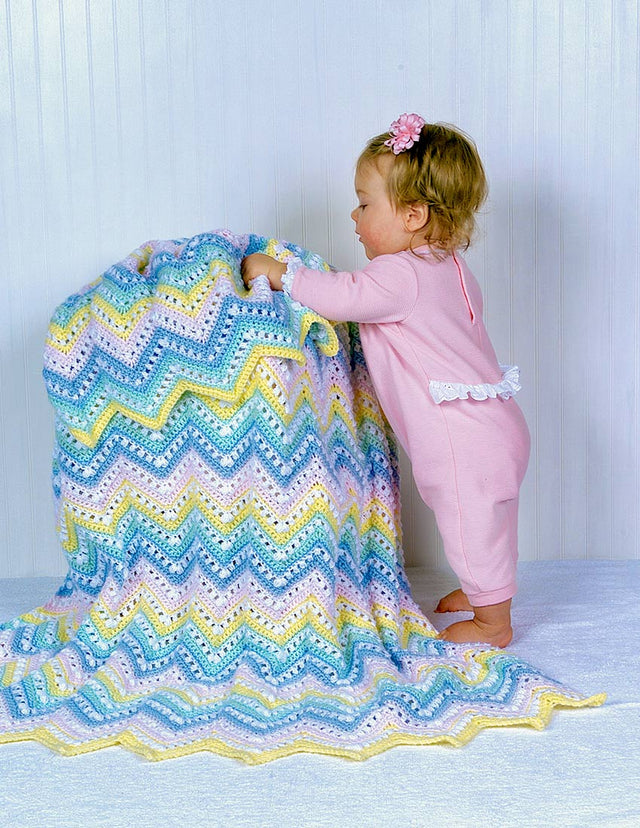 Crochet this colourful Cluster Ripple afghan with our easy-to-follow pattern. This pretty baby afghan was designed with Mary Maxim Baby Soft yarn, a DK sport weight that offered 160 yds/1.75 oz. Baby Soft is not available, but we have a wonderful selection of DK yarns that will be perfect for this project! You'll need these supplies: White (5), and 3 each of Yellow, Pink Blue, and green. Also, requires a crochet hook size U.S. H/8 (5 mm). Finished size 36 x 48" (91.5 x 122 cm) Intermediate crochet.