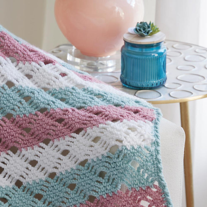 Bring your living space to life with our Criss Cross Blanket, designed to create a cozy atmosphere. Its unique criss cross pattern, horizontal colour banding and a unique edging provide an eye-catching visual texture, perfect for sprucing up any room. Enjoy the warmth and style of our Criss Cross Blanket! Kit includes Mary Maxim Starlette yarns and instructions. Requires crochet hook size 5.50 mm. Finished size: 47 x 56" Intermediate Crochet.