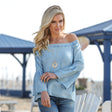 Upgrade your summer wardrobe with our Denim Scoop Neck Tunic! The fun and flirty bell sleeves add a touch of style, while the comfortable scoop neck makes it perfect for any occasion. Elasticized at the top of the sleeves so you can wear it with the off-the-shoulder look. Can be worn on or off the shoulder. Versatile enough to be paired with jeans or a skirt, this tunic is a must-have for your summer vacation. 100% rayon.