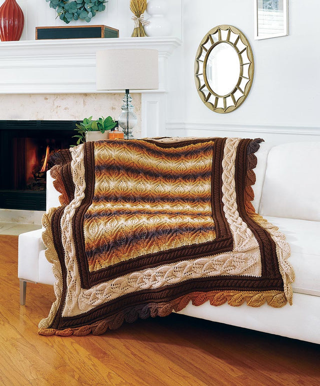 Bring the beauty of autumn into your home with this downloadable pattern by Elaine Carey! Use your skills to create a stunning work of art that will be the envy of all your visitors. Created using Red Heart Super Saver Latte Stripes 5 skeins (236 yds ea) and Red Heart Comfort (867 yds) in Java, Tan (1 ball each), a 36" (90 cm) circular needle size 8 (5.0 mm) and stitch markers. Finished size 43 x 53" (109 x 134.5 cm) Intermediate Knit.