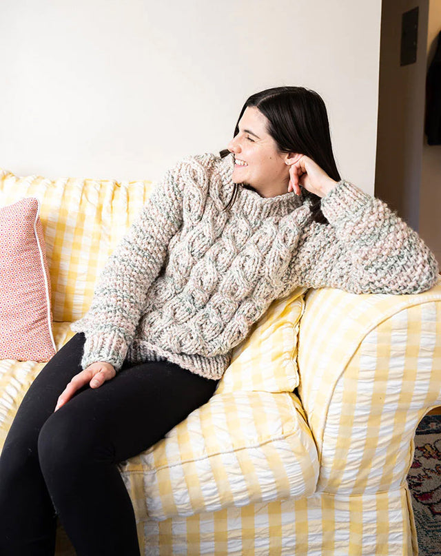 Requires 7 (10) Skeins of Lion Brand Wool-Ease Thick & Quick. Shown in Seashell (Not Available).Free Corlears Cable Sweater Pattern is backordered and your entire order will ship as soon as it is back in stock.