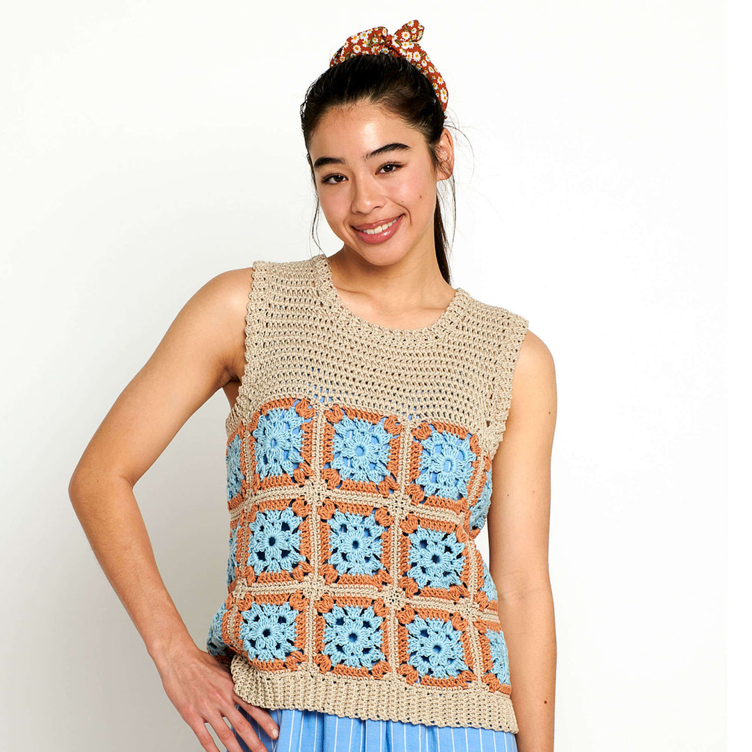 Requires 4-7 balls of Bernat Softee Cotton yarn. Shown in Feather Grey (MC).Free Granny Square Crochet Top Pattern is backordered and your entire order will ship as soon as it is back in stock.
