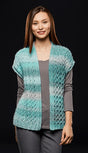 This open front vest with cap sleeves is the perfect upper body warmer. The cap sleeves keep your shoulders warm and the length of the vest will keep your back warm also. No buttons means no binding at the waist and chest allowing for ease of movement and the lovely lace pattern gives this piece a feminine appeal. Create using Premier Puzzle yarn. Requires 2-3 ball and needle size 10 (6.0 mm). Sizes Small-Large. Intermediate Knit.