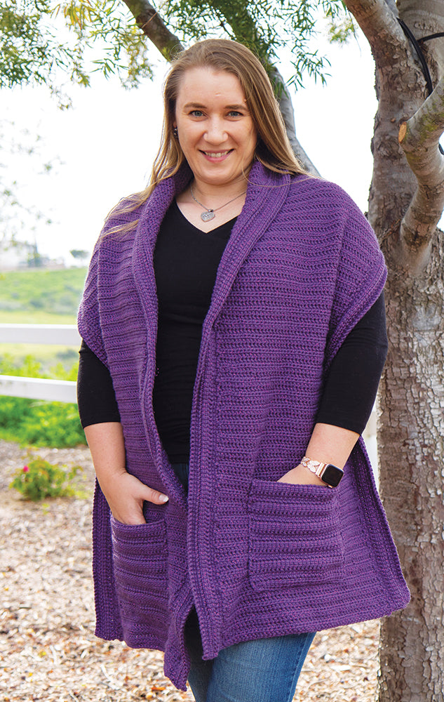 Linked stitches make this shawl extra warm and the Glimmer yarn gives it that little bit of sparkle and the pockets are a bonus! Perfect for those cold winter days and nights. Designed by Nicki's Homemade Crafts. Kit includes Mary Maxim Glimmer yarn and instructions. Requires crochet hook size 5.0 mm. Finished size: 16.5 x 82". Intermediate crochet.