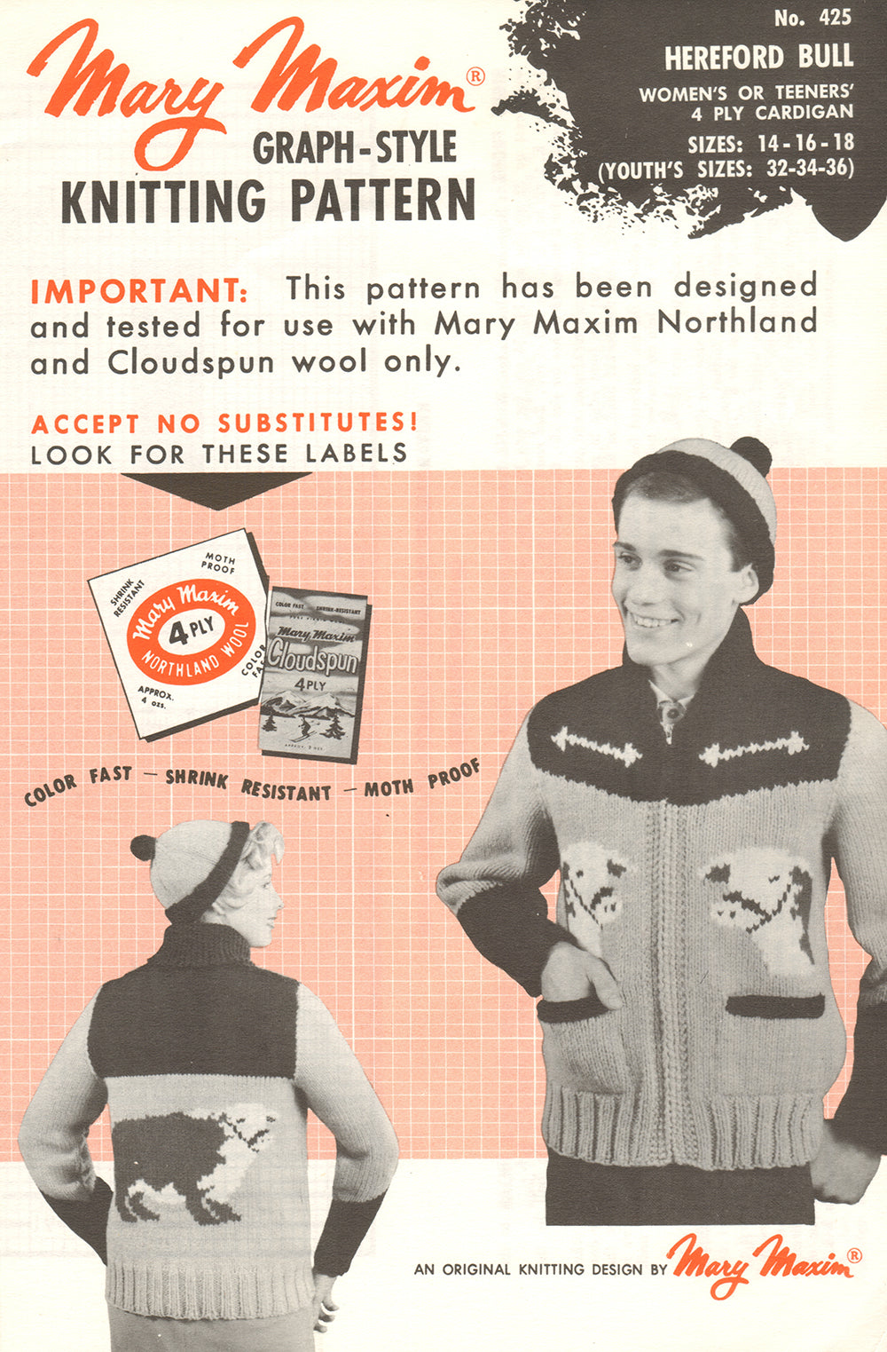 Knit this Hereford Bull cardigan with our original pattern. Graph pattern with set-in sleeves and shawl collar design. Design was created using Mary Maxim Northland, or Titan bulky yarn which offered 80 yards per skein at the time. Now with a larger variety of bulky yarns to choose from, including Mary Maxim Titan, you can customize this project to suit. Keep in mind yardage may vary. Materials List: All Sizes: MC (7 skeins), CC1 Yoke and Cuffs (4 skeins), CC2 Bull (1 skein), CC3 Bull (1 skein). All you need are knitting needles size U.S. 6 (4 mm) and 9 (5.5 mm). to begin. Larger sizes available. Fits sizes 14-16-18—Intermediate knit.
