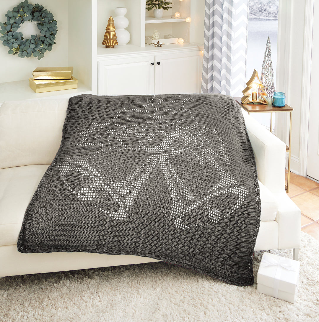 Ring in the holidays with this lovely filet throw. Perfect in your livingroom, bedroom, guest room or den. Kit includes Caron Simply Soft yarn and instructions. Requires crochet hook size 5.0 mm. Finished size 46 x 59". Intermediate Crochet.