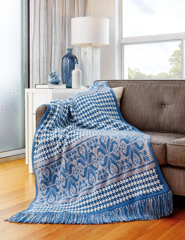 This elegant pattern, designed by Elaine Carey, is available for purchase and has won Canada's Grand Prize. Scandinavian Star design is combined with the classic houndstooth pattern to make this amazing throw. Created using Mary Maxim Maximum Value worsted weight yarn, which offered 474 yds per skein. We have an amazing selections of worsted weight yarn, including Maximum Value so your color options are endless for this project! Just keep in mind yardage varies. Materials List: Mary Maxim Maximum Value Med Denim (4 balls), White (3 balls), Lt Grey (3), 40" (102 cm) crochet on the double hook size 5.5 mm, and crochet hook size 5.5 mm. Finished size 42" x 60"—Intermediate crochet.