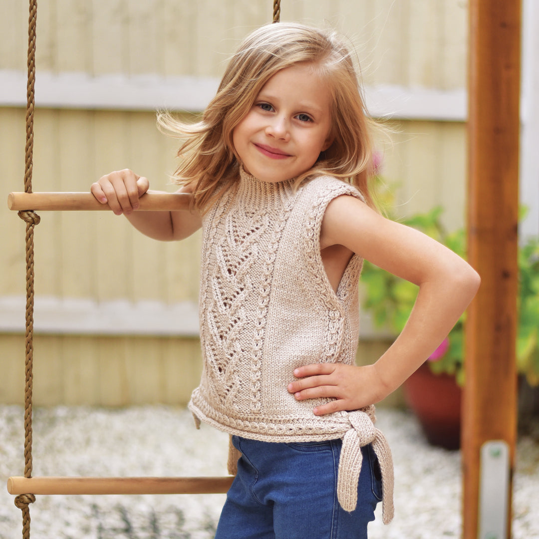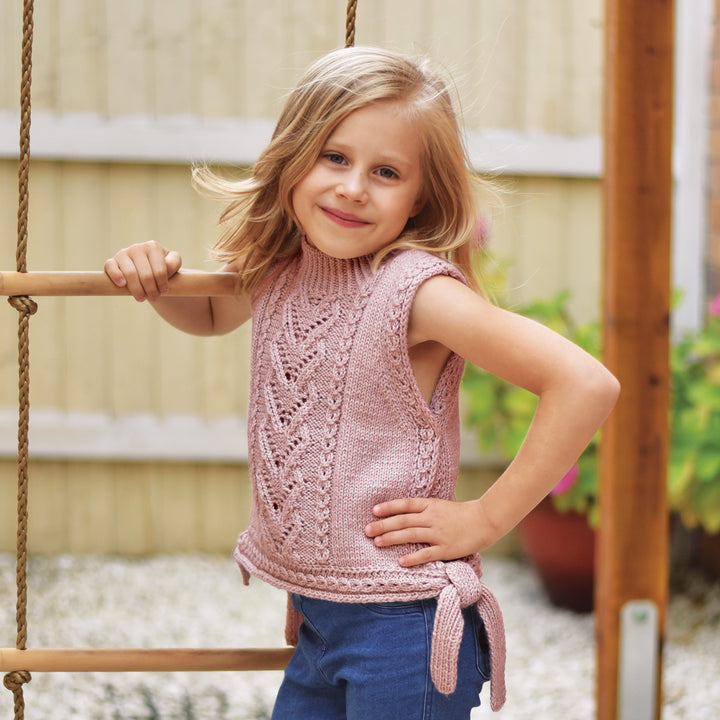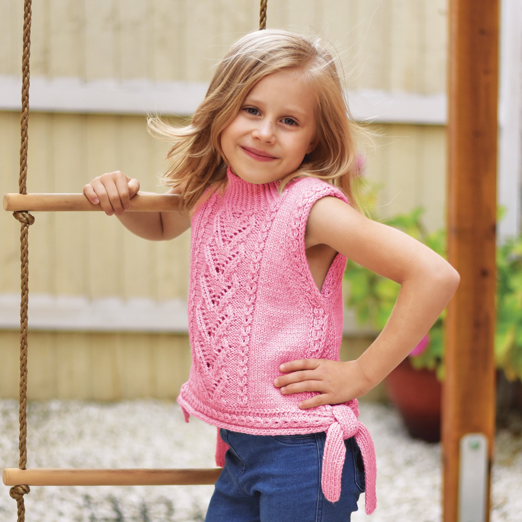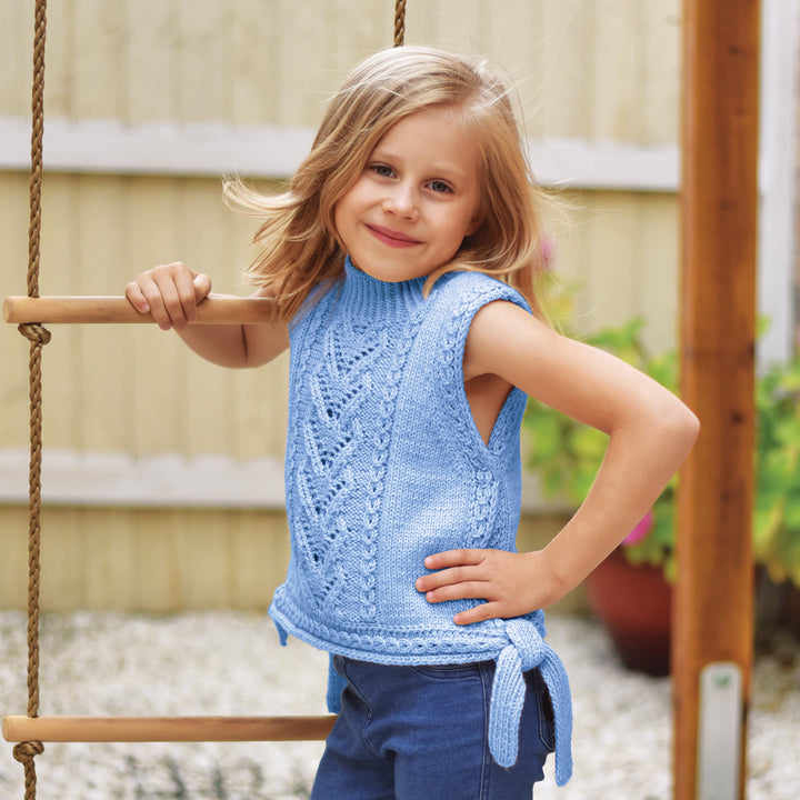 Stay warm and stylish with the Hoya Vest - featuring cute and trendy ties at the waist, a sleeveless design, and a short turtleneck with cabling details. Experience the perfect blend of fashion and comfort in this cute summer top. Designed by Tatsiana Matsiuk. Kit includes Mary Maxim Mellowspun DK yarn and instructions. Requires 24" (60 cm) circular needle size 3.50 mm and needles sizes 3.75 & 4.0 mm. Sizes 18 months - 16 years. Intermediate Knit.