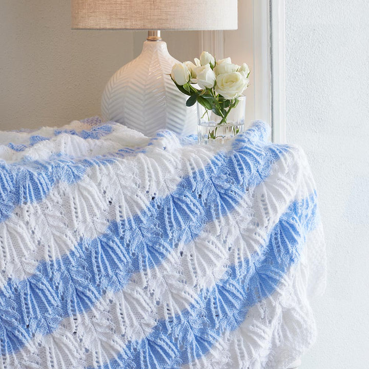 Add a touch of colour to baby's room with this soft, lacy blanket. Kit includes Mary Maxim Baby's Best yarns and instructions. Requires 36" (90 cm) circular needle size 4.5 mm. Finished size 34 x 40". Intermediate Knit.