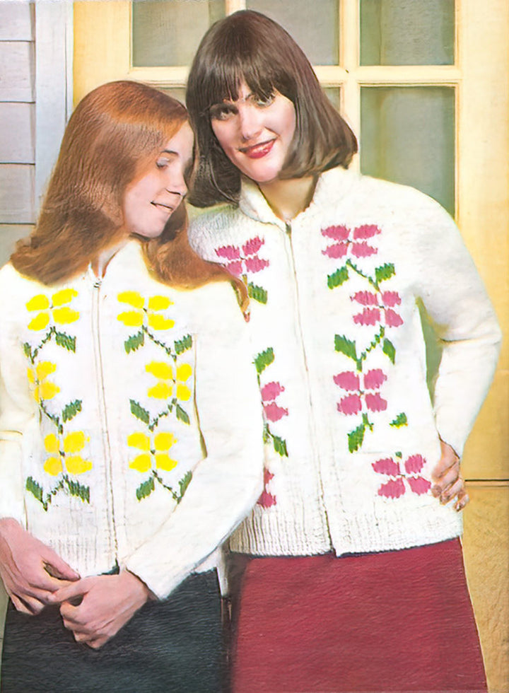 Knit the Ladies' cardigan (girl's size sold here) with our vintage graph-style pattern. Color image scanned from the 1960 & 1965 catalog! This design was originally knit with Mary Maxim Northland bulky-weight yarn, which had 80 yards per skein. We now offer a great selection of bulky yarns to suit your style, including Mary Maxim Titan. Be aware yardage may be different. Materials List: All Sizes MC (9 skeins), CC1 (Leaves/Vine and CC2 Flower (1 skein each). Also requires U.S. 9 (5.5 mm) and 6 (4 mm) knitting needles. Fits sizes 32-34-36—Intermediate knit.