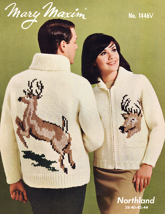 Knit this one-of-a-kind Whitetail Deer cardigan using our exclusive picture-graph pattern! The sportsperson in your life will love it! You won't find this on store shelves! Designed using Mary Maxim Northland bulky weight yarn that provided 80 yds per skein at the time. We have a wonderful selection of bulky yarns in all of your favorite brands, but keep in mind yardage will vary. We recommend Mary Maxim Titan for this project! Materials List: MC Sz 38-40 (48 oz.), Sz 42-44 (56 oz.) All Sizes: CC1, CC2, CC3, CC4 (4 oz each). Also requires knitting needles size U.S. 7 (4.50 mm) and 10 (6 mm). Fits sizes 38-40-42-44—Intermediate knit. Also available in sizes 32-34-36!