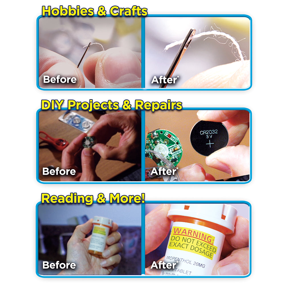 Mighty Sight™ is the incredible magnifying eye-wear with LED lights everyone is talking about. Making everything 160% bigger, with Mighty Sight™ you can see everything in incredible detail while keeping your hands completely free! When you’re working in a low light area, just click on the built-in LED lights for extra brightness. Give the gift of seeing the world more clearly with this amazing LED magnifying eye-wear. Now you can read your favourite novel or flip through your favorite newspaper or magazine without straining your eyes and getting a massive headache. Mighty Sight™ helps you to indulge in these everyday simple pleasures in life without the needing to remove your prescription wear or sunglasses! Screen calls, read medicine labels write emails, read knitting patterns, and more! The days of profusely squinting to read your credit card bill are gone thanks to Might Sight™.