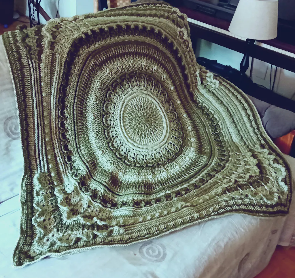 Transform your living space with our mesmerizing Moonlit Magic Throw! This stunning statement piece in the round then evolves into a beautifully textured square, a true masterpiece of stitches. Make a bold and sophisticated statement with this throw that adds a touch of magic to any room. Designed by Bag-O-Day Crochet. Kit includes Bag-O-Day Tonal Hues yarn and instructions. Requires crochet hook size 5.50 mm. Finished size: 56 x 56". Intermediate Crochet.