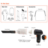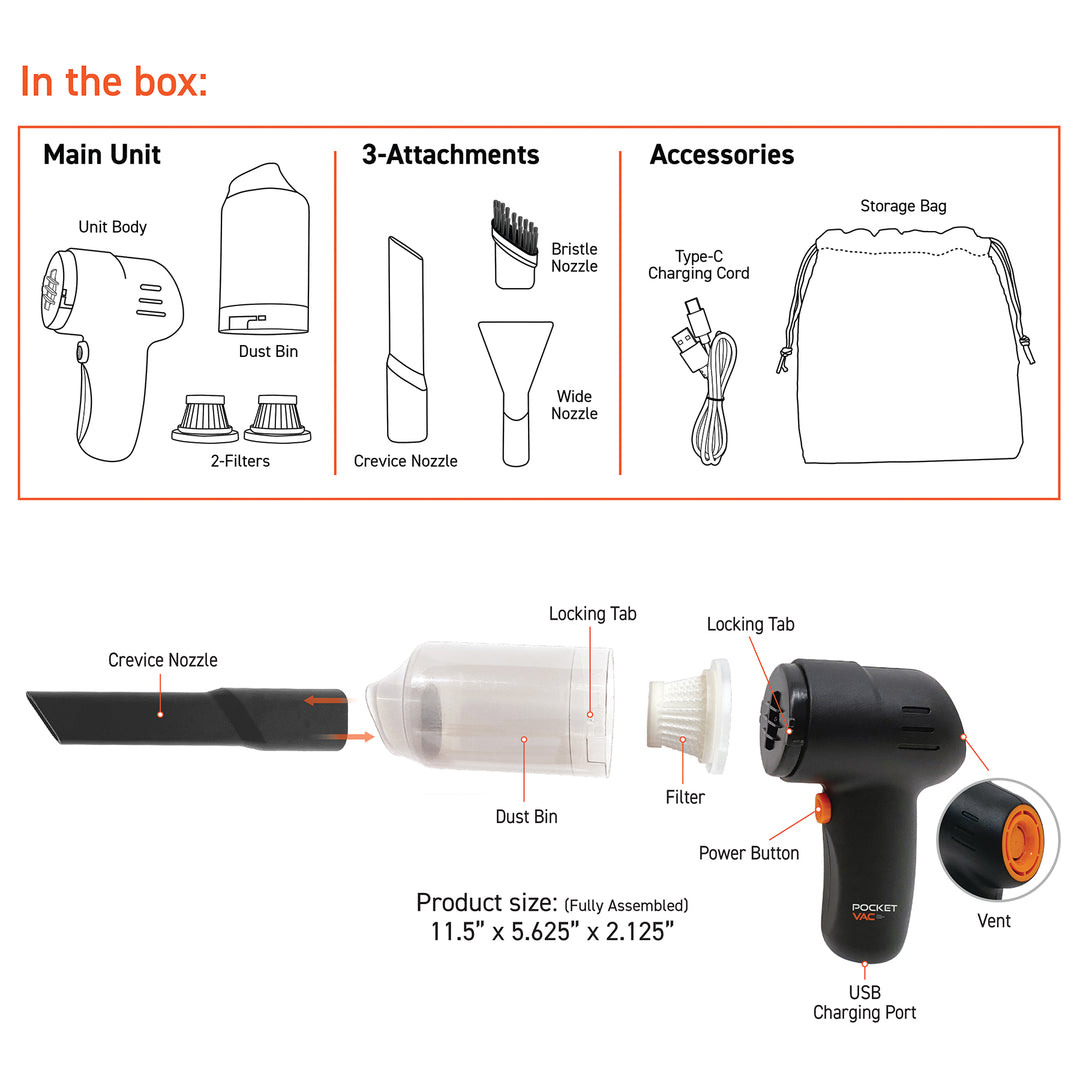 The lightweight hand-held vacuum with strong suction picks up dust, debris, and dirt from the tight areas to larger surfaces. Makes spot-cleaning your home, car, work area a breeze. Easy charging from any USB power source. The compact design allows you to easily store in a drawer, glove compartment, tool box and more. Includes USB charging cord, 3 attachments and storage bag.