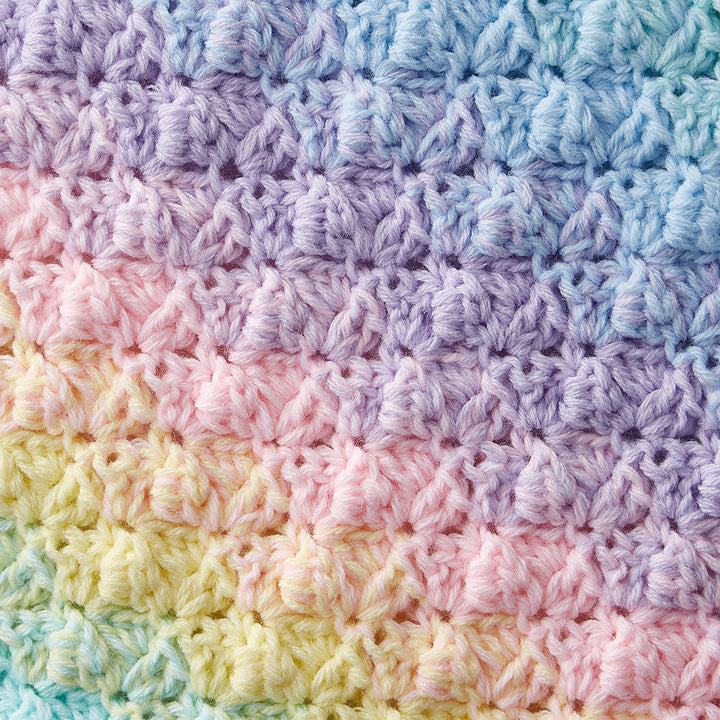 The Sherbet Stripes Baby Blanket features a delightful blend of soft colours that gently fade into each other, creating a soothing and playful look. Crafted for ultimate comfort, this super cozy blanket is perfect for keeping your little one warm and snug. Its gentle hues add a touch of sweetness to any nursery, making it a charming and practical addition to your baby’s essentials. Whether for nap time or stroller rides, this blanket wraps your baby in softness and style with every cuddle. Kit includes Mary Maxim Twinkle yarns and instructions. Requires crochet hook size 4.50 mm. Finished size 32 x 41". Easy Crochet.