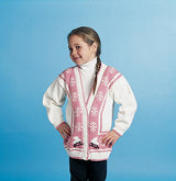 Create this charming Figure Skating cardigan with our classic graph-style pattern design. It will become a staple in her wardrobe and everyday life, bringing her dreams of Olympic figure skating to reality! Created with Mary Maxim Starlette worsted-weight yarn, which offered 220 yards per skein at the time. With a wide variety of worsted-weight yarns and top-quality brands like Mary Maxim Starlette to choose from, you can easily personalize it to match her favorite colours. Keep in mind yardages vary. Materials List: White (5 balls), Rose (1), Black (35 yds), Sand (15 yds), Grey (15 yds), Brown (15 yds), and knitting needles size U.S. 5 (3.75 mm), and 8 (5 mm). Fits sizes 4, 6 Intermediate knit.