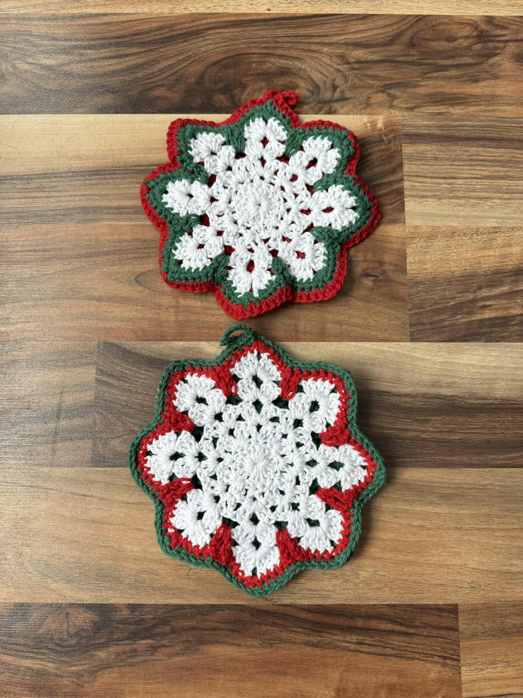 Add a festive touch to your kitchen with these Snowflake Potholders. Designed to protect your table from heat while bringing seasonal charm to your holiday dining, they combine practicality with holiday spirit. Perfect for handling hot dishes or serving warm treats, these potholders make every meal feel cozy and special. Kit includes Lily Sugar'n Cream yarn and instructions to make a set of 3 as shown. Requires crochet hook size 4.0 mm. Finished size: 9" wide. Intermediate Crochet.