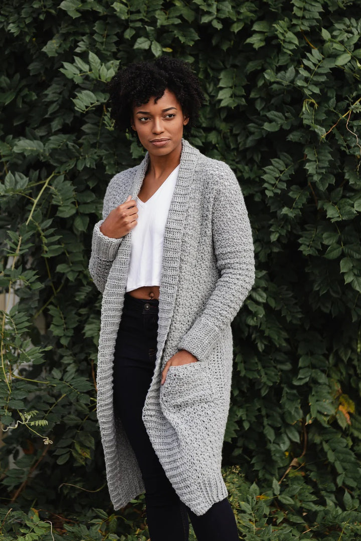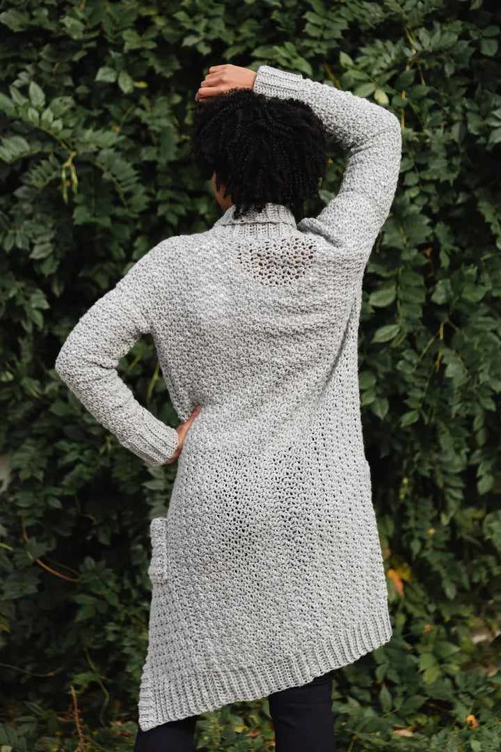 Slim-fit cardi with wide folding shawl collar and generous front pockets. Long body and sleeves will keep your whole body warm and comfortable. The perfect cardi to snuggle up on the sofa with a good book or watching a great movie. It's the perfect cardi for any look, all season long. Enjoy comfort and style combined into one eye-catching piece. Designed by Toni Lipsey_TL Yarn Crafts. Kit includes Mary Maxim Starlette yarn and instructions. Requires crochet hooks sizes 6.0 mm & 7.0 mm. Sizes Small - XLarge. Intermediate Crochet.