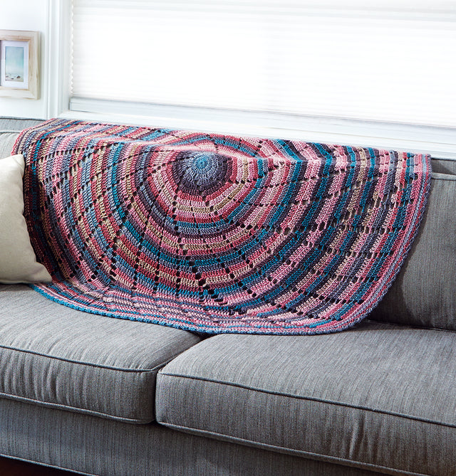 Add a unique touch of textural decor to your home with our Swirling Colours Throw! Featuring a stunning swirl pattern crocheted in the round, this throw is perfect for any room. Its unique design will make a beautiful statement piece while providing warmth and comfort. Elevate your decor with this stunning throw. Kit includes Mary Maxim Prism yarn and instructions. Required crochet hook size 5.0 mm. Finished size 48" diameter. Intermediate Crochet.