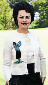 Show off your knitting skills with our graph-style cardigan pattern, perfect for chilly spring or fall days on the golf course! Make a statement and stay cozy with this must-have piece. Featuring set-in sleeves, a crew neckline, and button front (no design on the back). Designed using Mary Maxim Double Knitting sport-weight yarn, that provided 100 yds per 2 oz skein at the time. With a variety of sport-weight yarns to choose from today, there are endless possibilities when using this pattern. We highly recommend Premier Basix with its beautiful array of hues! Keep in mind yardage differs. Materials List: Sz 14-16 MC (7 skeins), Sz 18 (8 skeins). CC1 Sweater, CC2 Skirt, CC3 Grass, CC4 Face & Legs (1 skein each). Requires knitting needles size U.S. 3 (3.25 mm) and 4 (3.5 mm). Fits Ladies sizes 14-16-18—Intermediate knit.