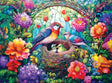 Nest yourself in puzzle joy with this absolutely magical scene! A charming family of colourful birds gathers together in their cozy home, surrounded by a breathtaking garden of stunning blooms. But here's where the magic truly shines—the entire composition glows against a mesmerizing stained glass backdrop that transforms this puzzle into a work of art. Watch as each piece reveals intricate details and radiant colours that celebrate nature's beauty in the most enchanting way. Perfect for bird lovers and stained glass enthusiasts seeking a puzzle that's as visually stunning as it is fun to assemble! Size 27 x 20". 1000 pieces.
