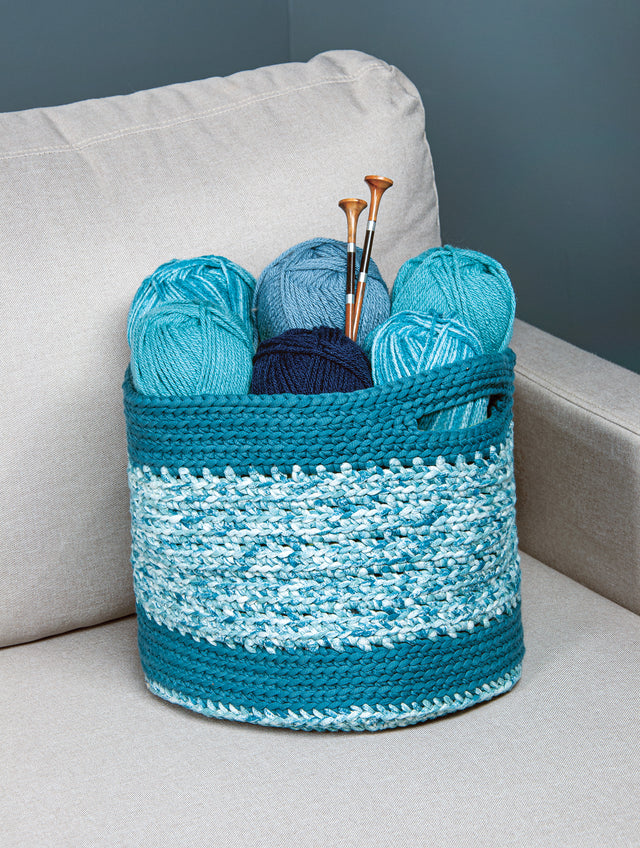 The perfect basket for storing your next project. Kit includes Mary Maxim Home yarns and instructions. Requires crochet hook size 6.0 mm. Finished size: 13 x 11 x 9". Easy Crochet.